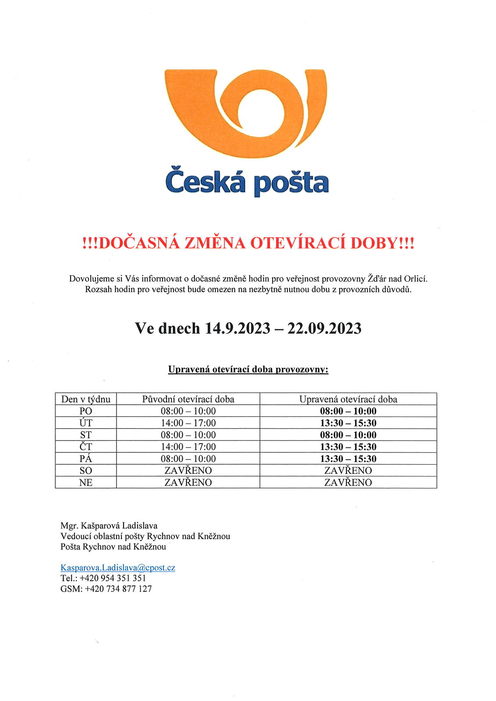Úvod > Obec > Aktuality > Dočasná změna otevírací doby pošty